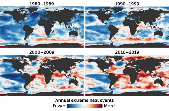 Um einen Kontext für die Häufigkeit und Dauer moderner extremer Hitzeereignisse zu schaffen, haben die Meeresökologen Kisei Tanaka, jetzt bei der National Oceanographic and Atmospheric Administration in Honolulu, und Kyle Van Houtan, jetzt am Loggerhead Marinelife Center in Juno Beach, Florida, die monatlichen Meeresoberflächentemperaturen von 1870 bis 2019 analysiert und kartiert, wo und wann extreme Hitzeereignisse von Jahrzehnt zu Jahrzehnt auftraten.